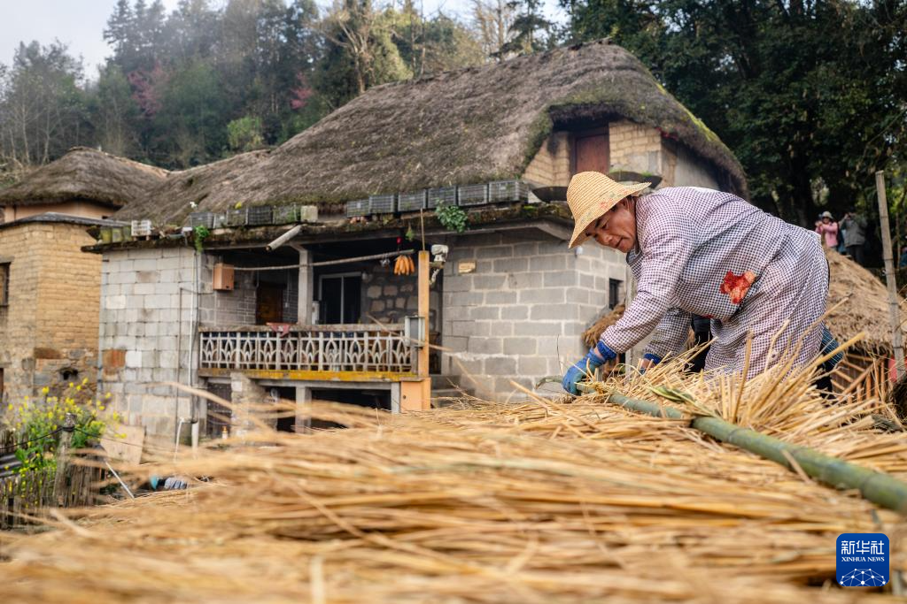 2月26包養日,在云南省元陽縣阿者科村,村平易近在補葺“蘑菇房”茅包養網排名草頂。